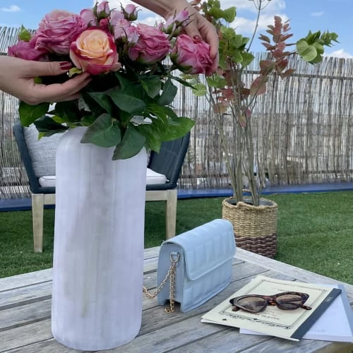 Grand vase Massa en verre dépoli rose pâle. Motif à facettes en relief ou linéaire très délicat.Grâce à sa teinte douce et élégante, ce vase s’incorporerafacilement dans un intérieur aux couleurs sombres. Il mettra en valeur vos bouquets et vos plus belles compositions de fleurs en hauteur. Existe en deux tailles. Chaque taille a un motif différent.