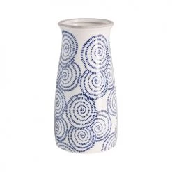 Vase allongé OCEANIAen céramique. Ce joli vase aux motifs circulaires estivauxvous emporte, grâce à ses volutes rondes en pointillets bleus qui évoquent les tourbillons des vagues de l’océan. Il s’adaptera parfaitement dans une décoration marine, minimaliste et épurée. Idéal pour une décoration d’inspiration méditérranéenne. Existe en trois tailles différentes.