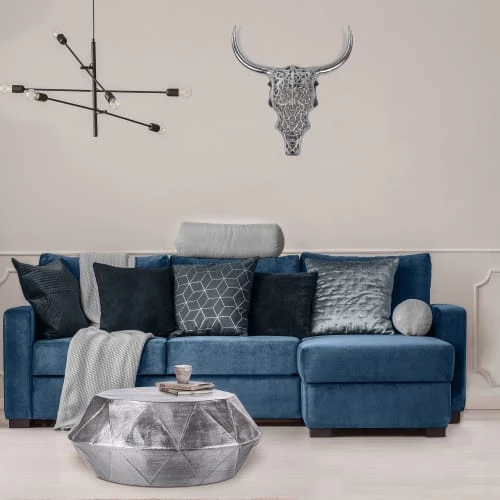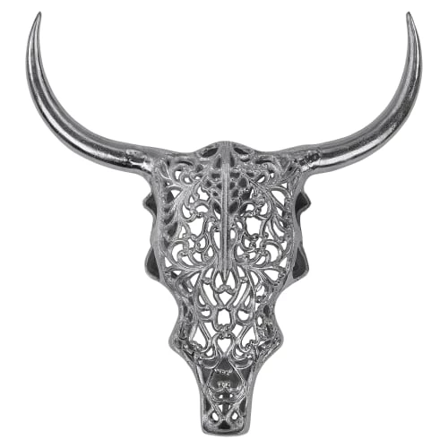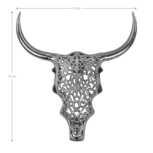 Chaque pièce est unique! Donnez à votre maison une ambiance unique avec cette sculpture murale au look glamour! Le crâne de taureau a été fabriqué à la main à partir d’aluminium poli avec une finition en nickel et se distingue non seulement par sa noble brillance mais aussi par son aspect extravagant. Grâce à son symbolisme fort et à sa haute qualité, cette décoration murale s’accorde parfaitement avec les autres accessoires argentés de votre intérieur et diffuse une atmosphère authentique, notamment en combinaison avec le bois et le cuir.