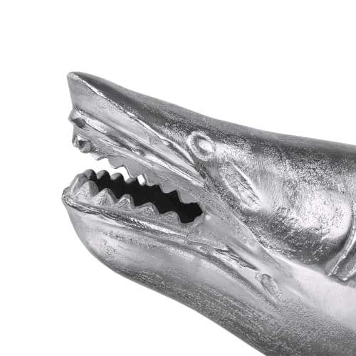 Chaque pièce est unique ! Donnez à votre maison une ambiance unique avec cette authentique sculpture de requin de WOMO-Design ! L’impressionnant requin a été fabriqué à la main en aluminium poli avec une finition nickel et se distingue, en plus de son éclat noble, par son rayonnement extravagant. Grâce à son design nautique et à sa qualité supérieure, cette sculpture s’accorde parfaitement avec d’autres accessoires en argent dans votre intérieur et diffuse une atmosphère authentique, surtout lorsqu’elle est combinée avec du bois et du cuir.